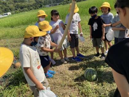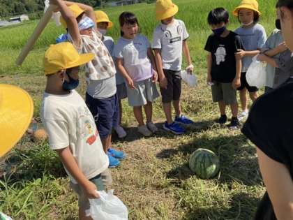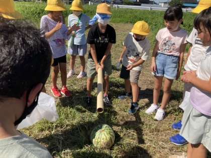 8月1日(月) 3年 スイカ割りをしたよ 公開日 2022/08/01 更新日 2022/08/01 3年生 登校日の今日は、子供たちが、楽しみにしていたスイカ割りを行いました。 「もっと前!」「もう少し右!」などと、みんな真剣にアドバイスをしていました。ガツンとスイカに棒が当たると、みんな拍手をしていました。