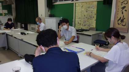 夏季休業中は、教職員の研鑽の時期です。今日は、校内研修で、「つよく」「明るく」「かしこく」の三つの柱について、1学期の取組を振り返り、2学期に育てたい子供像や取り組む内容、計画等について話合いました。これからの学校経営に、生かしていきます。