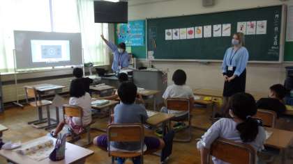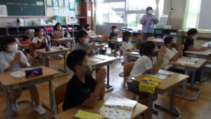 2学期最初の外国語活動の時間です。果物や色などの英単語をブリジット先生の後に続いて元気よく答えています。歌を歌ったり、キーワードゲームをしたりしながら、楽しく活動することができました。