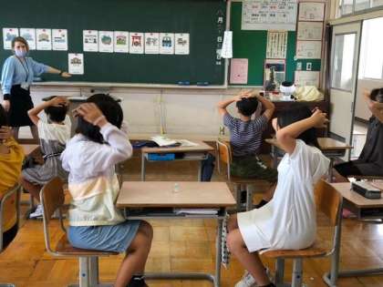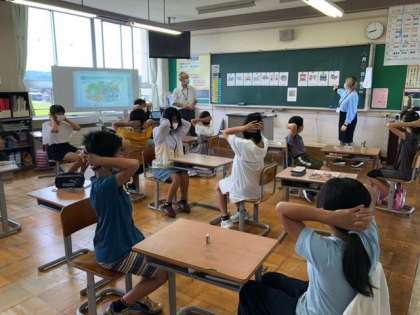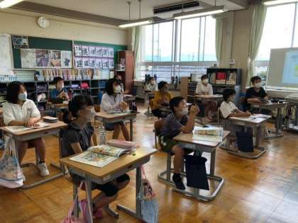 8月30日(火)5年生 外国語の学習 公開日 2022/08/30 更新日 2022/08/30 5年生 英単語の発音とリスニング練習をしています。黒板のカードの単語をみんなで読み、ALTの先生がキーワードの単語を読んだら消しゴムをとる、速く消しゴムをとった方が勝ち!というゲームを楽しんでいました。