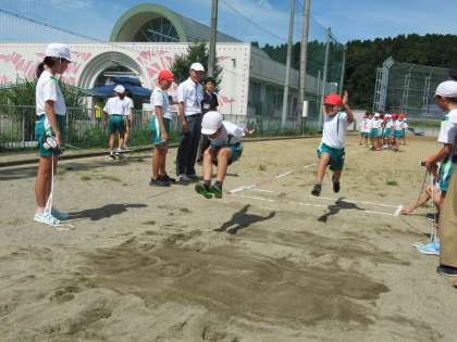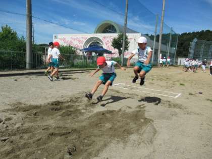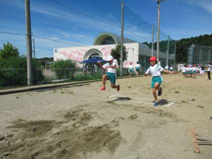 5・6年生といっしょに、グラウンドで走り幅跳びの練習をしました。勢いよく助走を付けて、思いっきり跳びます。