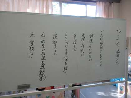 つよく委員会では、「どんな朝日小学校にしたいか」を改めて考えました。「健康で、けがをしない学校にしたい。」「みんな手洗いをしてほしい」「体育館を使った後に、しっかりと片付けができる学校がいい」「給食をたくさん食べて、食べ残しをなくしたい」「休まずに、みんなが楽しく登校できる学校がいい」と思いを伝え合いました。