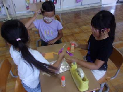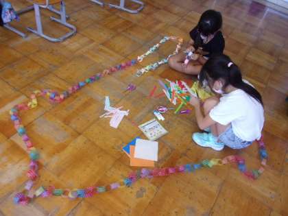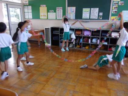 9月9日(金)2年生 かかりかつどう 公開日 2022/09/09 更新日 2022/09/09 2年生 2学期に新たに登場した、教室を飾り付ける「ハッピーきらきらかざり係」です。折り紙をつなげて作った飾りや、折り紙で折ったタコなどの動物を、教室や廊下に飾り付け、教室周辺の雰囲気を明るくしてくれています。係以外の子供たちも協力して、とても長くカラフルな飾りができています。