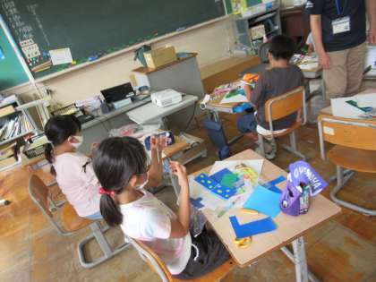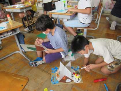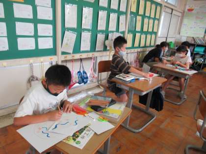 9月13日(火)3年生 図工の学習 公開日 2022/09/13 更新日 2022/09/13 3年生 「くるくるランド」という作品を作っています。くるくると回すと、絵が変わる作品です。折り紙を切ったり色鉛筆やマーカーで絵を描いたりしています。うさぎやねこ、海、宇宙など・・・いろいろな世界観がすてきです。