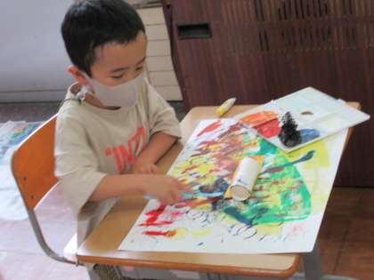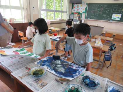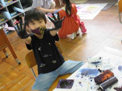 9月14日(水)1年生 図工の学習 公開日 2022/09/14 更新日 2022/09/14 1年生 水彩絵の具やローラー、家から持ってきたカップ等を使って、作品を作りました。夢中になりすぎて、手や腕が真っ黒になった子も。普段使わない道具を手に、子どもたちは楽しそうに取り組んでいました。