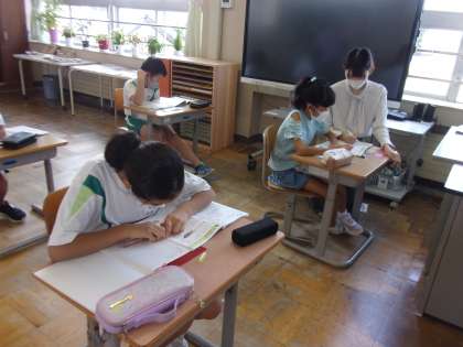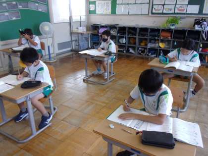 算数科で、割り算の単元の学習の締めくくりをしています。一つ一つステップアップしながらゆっくりじっくり割り算に取り組んできました。考え方を共有し合い、トライし合い、確かめ合って進めるうちに、「できた」「分かった」の喜びも大きくなってきました。自信をもって次に進めるよう、復習も頑張りたいですね。