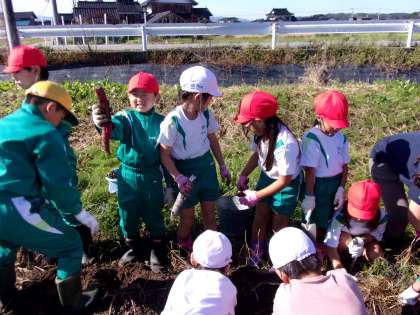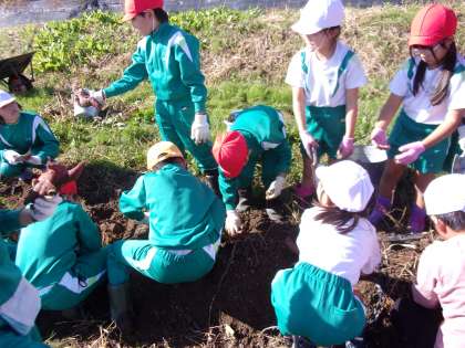 9月29日(木) 下学年さつまいもほり 公開日 2022/09/29 更新日 2022/09/29 3年生 今日はすっきりと晴れた空の下、下学年の子供たちは朝日の子供わいわい農園へ行き春に苗を植えて大きく育ったさつまいもを掘りました。 子供たちは、自分の顔よりも大きいさつまいもがとれて大満足の笑顔でした。