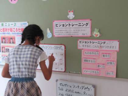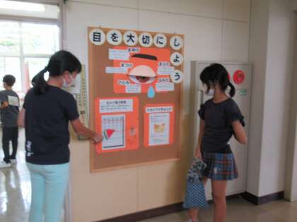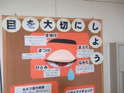 10月3日(月) 目の愛護月間 公開日 2022/10/03 更新日 2022/10/03 なかよし班活動 10月の保健目標は、「目を大切にしよう」です。目をテーマに、保健室の掲示を新しくしました。自分で視力を測るコーナーや、ドライアイのチェック、ビジョントレーニングのコーナーなど、楽しく目について学べる掲示になっています。