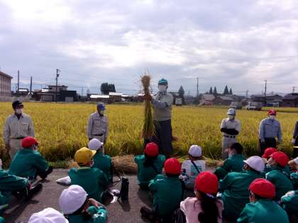 秋晴れの下、小規模特認校支援協議会、同朋会、下友坂地区の皆さんのお力添えをいただき、稲刈り体験をしました。