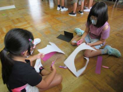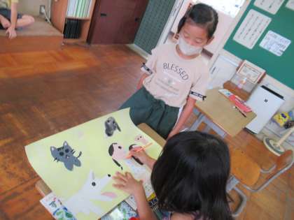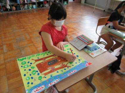 10月4日(火)2年生 図工の学習 公開日 2022/10/04 更新日 2022/10/04 2年生 以前から描いていた絵が、ついに完成しました。最後の仕上げに取りかかっています。終わった後は、お面作りをしました。ウーパールーパーを作る子や、去年の学習発表会で演じたわらしべ長者のものを作る子もいました。