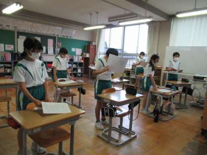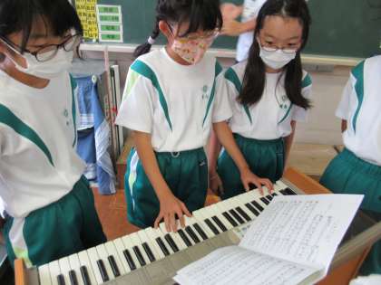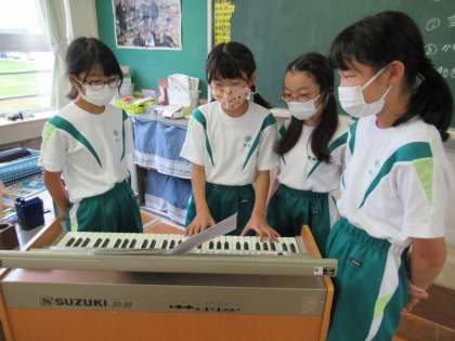 10月5日(水)6年生 歌唱の練習 公開日 2022/10/05 更新日 2022/10/05 6年生 学習発表会に向けて、発表する歌の練習をしています。キャラクターをイメージした楽しい楽曲に、思わず身振り手振りで表現していました。6年生自身が伴奏を担当する曲もあり、みんなと一緒に歌いながら、伴奏も練習中です。