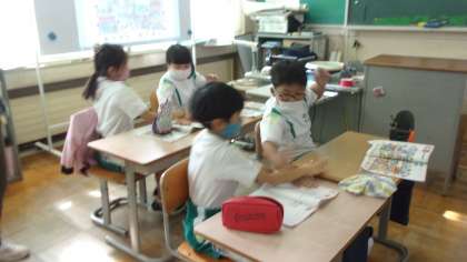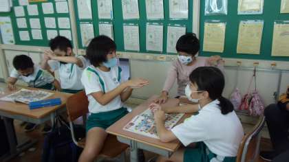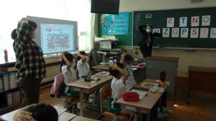 「アルファベットとなかよし」の学習をしています。キーワードゲームを友達と楽しく行いました。