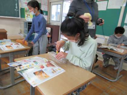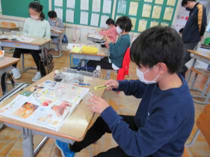 11月1日(火)3年生 図工の学習 公開日 2022/11/01 更新日 2022/11/01 3年生 空き容器を変身させる学習です。空き容器を使って、貯金箱や飛行機など様々なものを作りました。カッターは、ものを押さえる手の位置に気をつけて、集中して使っています。