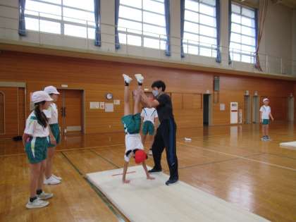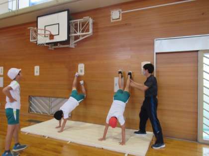 11月1日(火)6年生 体育の学習 公開日 2022/11/01 更新日 2022/11/01 6年生 マット運動に取り組んでいます。倒立前転に挑戦しました。まずは壁倒立から始めます。先生に補助に入ってもらって、何度も練習に励みました。成功したときは、「できたよ!見ていて!」とうれしそうに仲間に話しています。