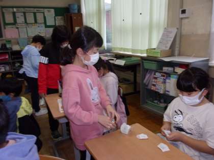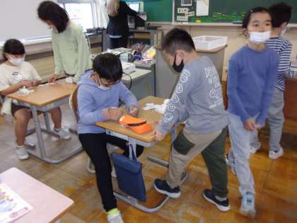 11月1日(火) 3年生 「アルファベットとなかよし」 公開日 2022/11/01 更新日 2022/11/01 3年生 今日は先週作ったハロウィン仕様のバッグを持って、友達に自分の名前の頭文字のアルファベットをもらいに行くゲームをしました。 ローマ字で自分の名前を書けるようになったので、アルファベットの形や発音に慣れて自信をもって活動しています。