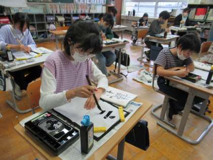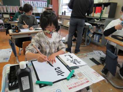 11月4日(金)5年生 書写の学習 公開日 2022/11/04 更新日 2022/11/04 5年生 今日は「読む」という字を練習しました。「この線が太くならないように、筆を立てて書きたい。」「こっちの線よりこっちの線の方が短く書くことを意識する」と書く前に目標を話し合ってから取り組んでいました。
