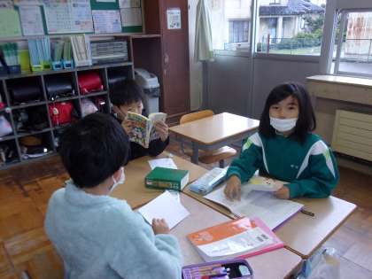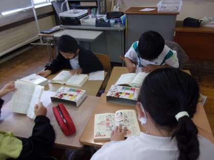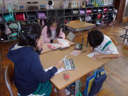 11月14日(月) 3年生 国語科「ことわざ・故事成語」 公開日 2022/11/14 更新日 2022/11/14 3年生 先週の学習参観で行った「ことわざかるたをつくろう」の続きに取り組みました。どうしてもこのことわざで作りたいと必死にいろんな辞書を調べて作っている子や例えの文を作るのに苦労している子などさまざまで、グループの中で助け合って学習しています。