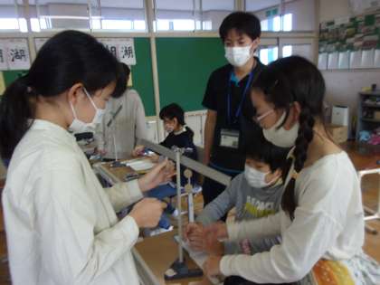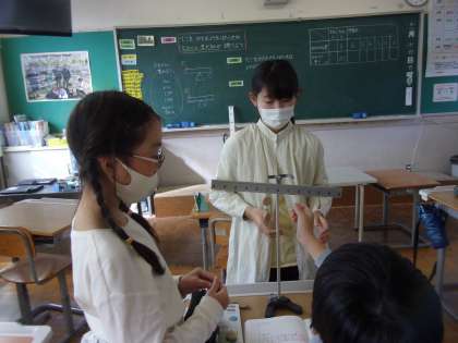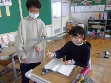 11月14日(月) 6年 理科の学習 公開日 2022/11/14 更新日 2022/11/14 6年生 てこの働きについてグループになって調べています。「この力点から・・」と学習した言葉を使いながら、てんびんがつり合うきまりを考えました。