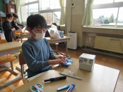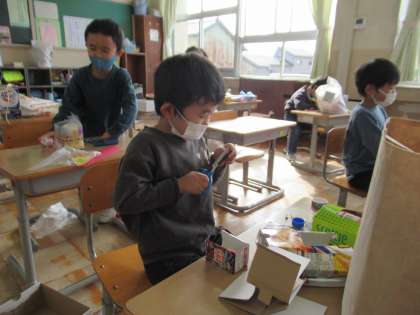11月15日(火)1年生 図工の学習 公開日 2022/11/15 更新日 2022/11/15 1年生 空き箱やペットボトルのふた、モールなどを使って、自由におもちゃを作っています。的当てゲームや、人形、占いゲームなど、それぞれ工夫を凝らして作り、楽しく活動しました。