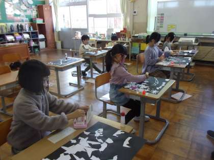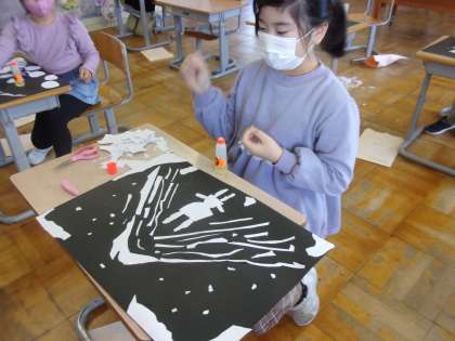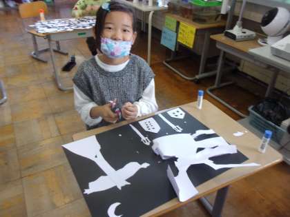 自分の表したい世界を、白と黒の世界で表しています。みんな夢中になってつくりました。