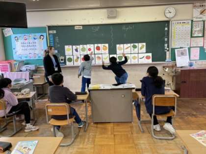 果物や野菜の単語を繰り返し発音しながら、英語に親しんでいます。