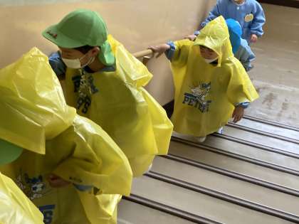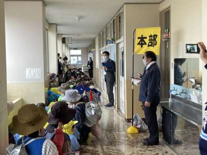 朝日保育所との合同避難訓練を行いました。今回の避難訓練は、牛ヶ首用水が氾濫し、警戒レベルが4になり避難指示が出たことを想定して行いました。いざというときに落ち着いて行動できるよう、日頃から防災意識を高めておきたいものです。