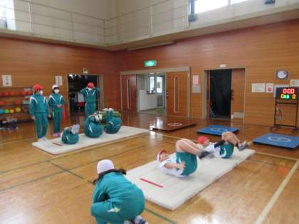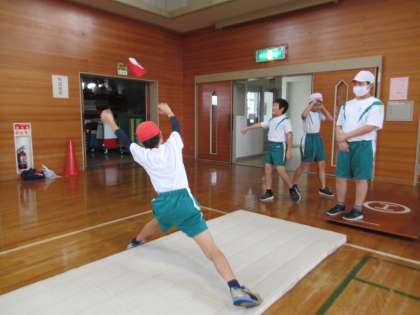 マット運動に取り組んでいます。首や手首のストレッチや、「ゆりかご」で転がる練習など、準備運動をしっかりして、それぞれ取り組みたい技に挑戦しました。5年生は、多くの子が倒立前転に挑戦しています。