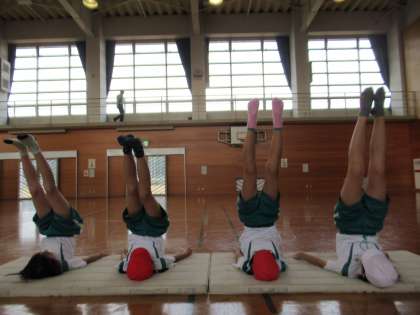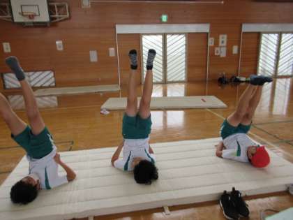 5年生と同様に、マット運動に取り組んでいます。6年生はシンクロして技を披露しています。