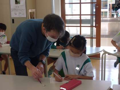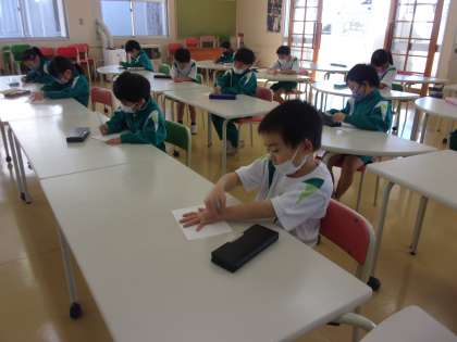 アメリカでは、11月にサンクスギビングという感謝祭が行われると、ジョナサン先生から教わりました。そこで、子供たちは感謝を伝えたい相手を考え、メッセージカードをつくりました。七面鳥をなぞり描きしたり、アルファベットを書いたりするなど、楽しんで活動しました。