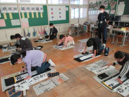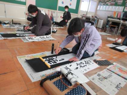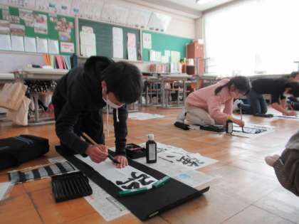 11月28日(月)6年 書初大会に向けて 公開日 2022/11/28 更新日 2022/11/28 6年生 書初のお手本が届きました。6年生の課題は「強い信念」です。どのように書いたらよいか、確認しながら、試しに1枚練習してみました。冬休み中もたくさん練習して、それぞれ上達できるようにがんばっていきましょう。