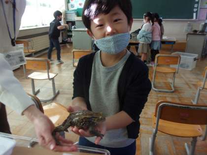 11月28日(月) 1年 ホクリクサンショウウオ出前授業 公開日 2022/11/28 更新日 2022/11/28 1年生 ホクリクサンショウウオ出前授業がありました。ファミリーパークの職員の方が、ホクリクサンショウウオの生態や、呉羽丘陵にすむ生き物について教えてくださいました。学習の後半には、実際に生き物たちを触らせてもらいました。ヘビや大きなカエル、カメたちに子供たちは大興奮!たっぷりと生き物たちとふれあうことができました。