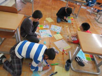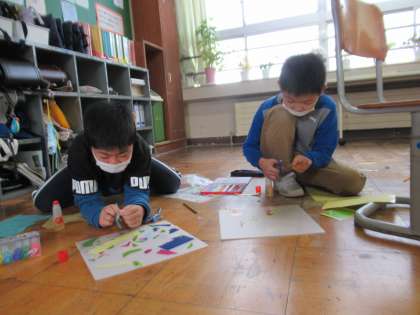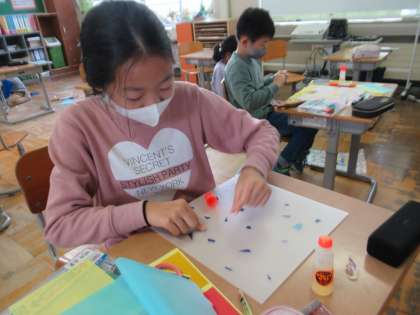 11月29日(火)4年 図工の学習 公開日 2022/11/29 更新日 2022/11/29 4年生 「光のさしこむ絵」という作品づくりに取り組みました。秋の景色や、メダカやカメが泳ぐ水槽、海、雪遊びをしている様子など、それぞれテーマを考えて、作品を作りました。