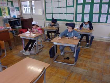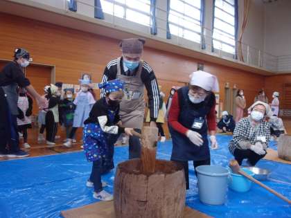 12月1日(木)下学年 もちつき会 公開日 2022/12/01 更新日 2022/12/01 1年生 地域の方々にご協力いただき、「もちつき会」を行いました。おいしいもちになるようにと、力を込めてリズムよく杵を振り下ろしてつきました。 教室では、あんこやきなこに包まれた餅を、おいしそうに食べる子供たちの笑顔が広がりました。