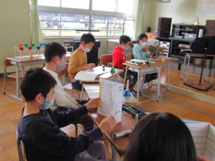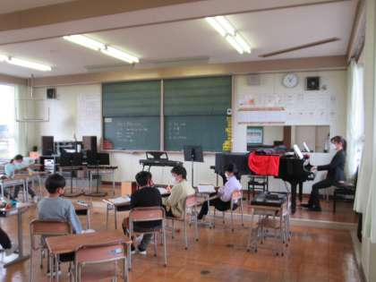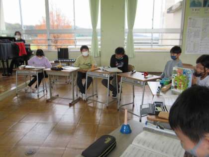 「きれいな音色をつくろう」と、トーンチャイムとハンドベルを使って、「茶色のこびん」の合奏や「チャレンジ!」という曲の合唱をしました。