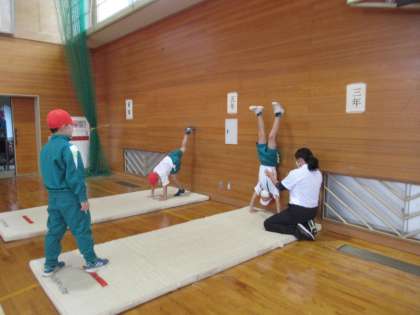 後半は、側転の練習に取り組みました。講師の先生のやり方をまねながら易しい動きから取り組むと、どの子も自分でうまくなったことを実感できました。
