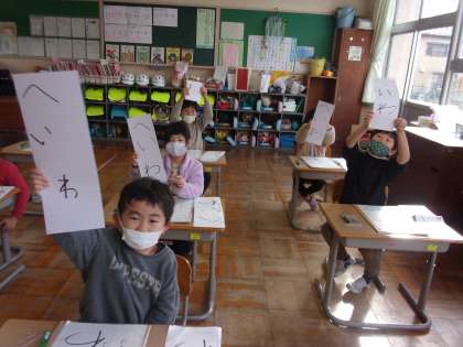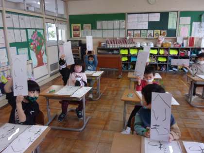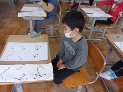 12月6日(火)1年生 書き初め練習 公開日 2022/12/07 更新日 2022/12/07 1年生 初めて書き初めに挑戦しました。1年生は「へいわ」と書きます。今日は、硬筆墨をしっかり持ち、濃く丁寧に書くことを意識しながら取り組みました。自分の字を見ながら、「次に書くときは、ここをもっと大きく書きたい」「線が濃くなったら、もっといい感じになるな」と、話していました。