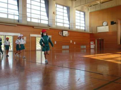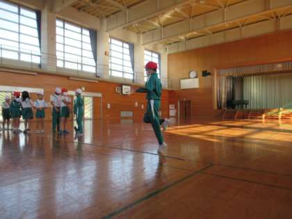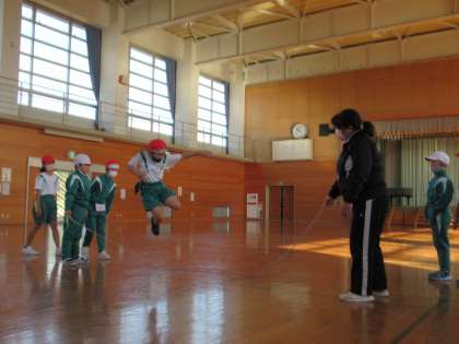 12月9日(金)3年生 大なわチャレンジ! 公開日 2022/12/09 更新日 2022/12/09 3年生 クラスみんなで、大なわの8の字とびにチャレンジしています。まずは縄を回さずに、片足で跳んで片足で着地する練習をしました。何度も練習して、だんだんとできるようになってきました。