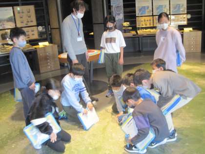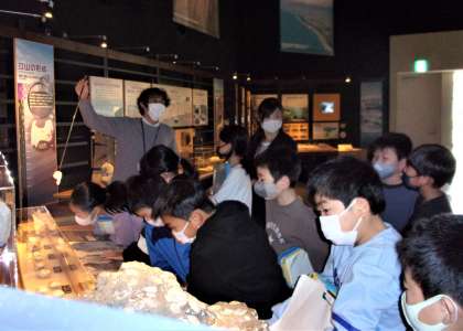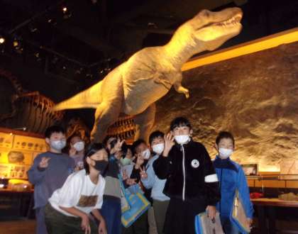 科学博物館1階の恐竜研究ゾーンでは、化石や恐竜の体に興味津々に見入る子供たちでした。地震で地形が変わった場所、化石が発見された地域など、学芸員の方の説明を聞いて頷きながら、富山の地形を足でたどりました。恐竜の足跡や歯形から、走る速度や食べ物が分かるという話に関心をもったり、この時代に僕達が生きていたらどうだったんだろう」と考えたりしました。