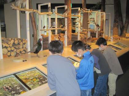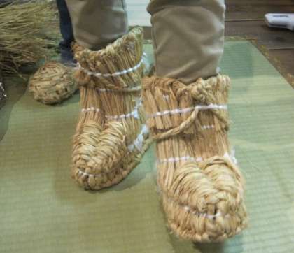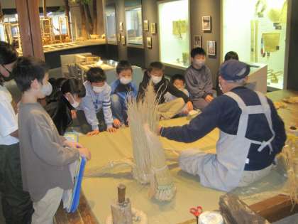 2階の丘陵と平野ゾーンでは、わらや縄でわらじや深靴を作る実演を見ました。昔の方は何時間もかけて縄を編みながら靴を作っていたことを知り、大変だと感じたり、実際履いて「ふわふわしてやわらかい」と軽やかに歩いてみたりしました。昔の暮らしは物がなくて不便そうだけれど、案外よさそうだなあとつぶやいた子供もいました。