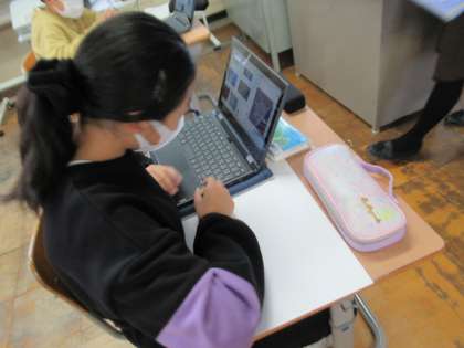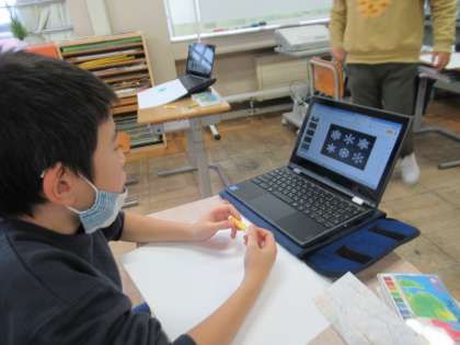 冬にぴったりの雪の結晶をテーマに作品を作っています。クロムブックで参考写真を探して、クレヨンで雪の結晶を描いています。どんな作品ができあがるか楽しみです。