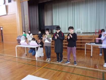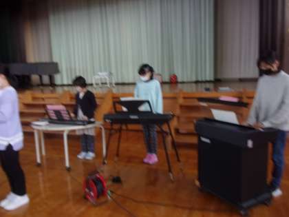 集会の発表に向けて、合奏の練習をしました。打楽器や鍵盤楽器の音が合わさり、素敵な音色が響きました。