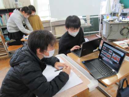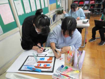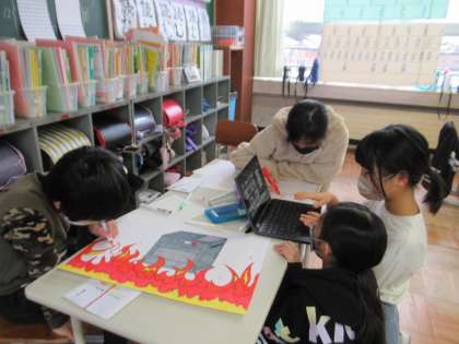 12月22日(木) 5年生 BFCの活動 公開日 2022/12/22 更新日 2022/12/22 5年生 BFCの活動として、火事の恐ろしさを伝えるための発表の準備をしています。団ごとに協力して、クロムブックで発表のスライドを作成したり、画用紙にイラストを描いたりしました。