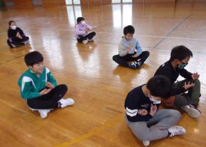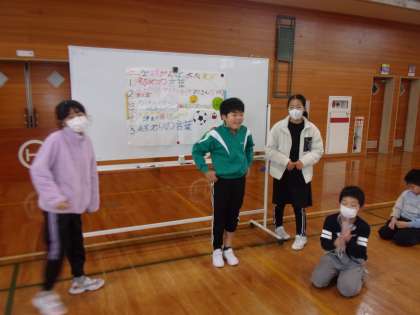 最後の学級集会は、教室係とハッピースマイル係が司会をし、各係からの企画を集めて、盛りだくさんのプログラムで楽しみました。「だるまさんの一日」では、「だるまさんがマッチョになった」「だるまさんが瞑想した」など一人の指令に沿ってみんなで動きます。各自の個性的な動きに互いに大笑いしました。サッカーやドッジボールや大縄も盛り上がり、息の上がる楽しい集会でした。