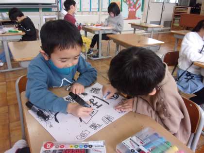 年長さんに朝日小学校のことを知ってもらい、小学校に通うことが楽しみになってほしいと考え、交流会の準備をしています。今日はクイズに使うカードをつくりました。