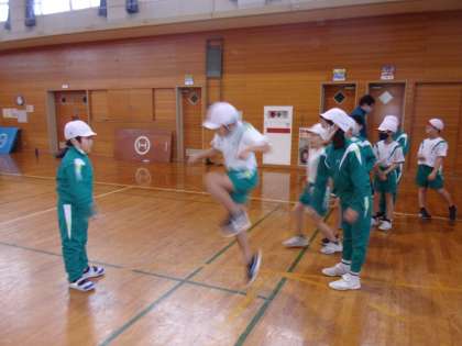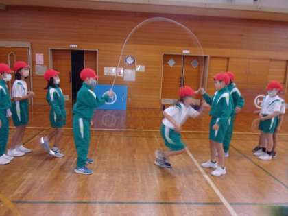 体育の時間に3・4年生合同チームで大縄練習をしました。一緒に取り組みながら、次の人が跳びにくそうな場面では「片足で跳んで抜けて」「もっと真ん中で」と、間が空いてしまう場面では「つながろうと意識して」「怖がらないで入って」と、アドバイスし合いました。縄を回す子供も、相手が跳びやすいようにリズムをとって大きく回し、リードしてくれました。「ナイス」「ドンマイ」「うまくなってきたね」と優しい声が響き、みんなのやる気が高まりました。挑戦を続けていきたいです。