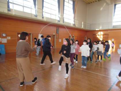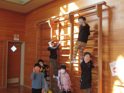 のびのびタイムになると、体育館はおおにぎわいです。4年生はサッカーに夢中、3年生は大縄にチャレンジ、1年生は登り棒にのぼったりおいかけっこをしたりと、それぞれ仲よく楽しく遊んでいました。