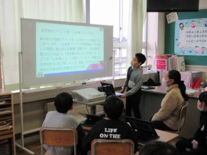 1月18日(水)4年生 社会の学習 公開日 2023/01/18 更新日 2023/01/18 4年生 ゆたかな自然を生かしている町について学習をしました。グループになってそれぞれテーマを決めて調べ、スライドにまとめました。そして、作ったスライドをもとに、みんなの前で発表しました。