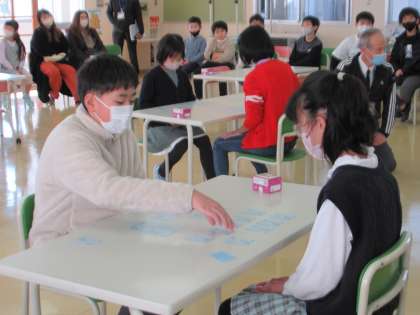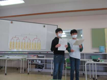 4・5・6年生で百人一首大会を行いました。昨日までに各クラスで予選を行い、今日は代表の児童が競い合いました。代表は真剣な表情で札に向き合い、応援に来た子も、クラスの代表の健闘を固唾をのんで見守りました。