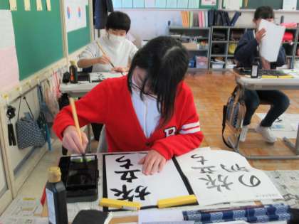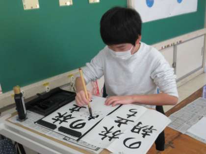 1月23日(月)6年生 書写の学習 公開日 2023/01/23 更新日 2023/01/23 6年生 「旅立ちの朝」という文字を練習しています。1枚の紙に5文字も書くので、文字の大きさやバランスを確認しながら慎重に筆を動かしていました。