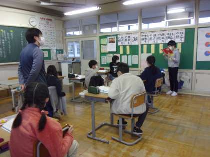 複数の説明文を読み、自分が考えたことを伝え合う学習をしています。友達の考えを聞いて、自分の考えをさらに深めています。
